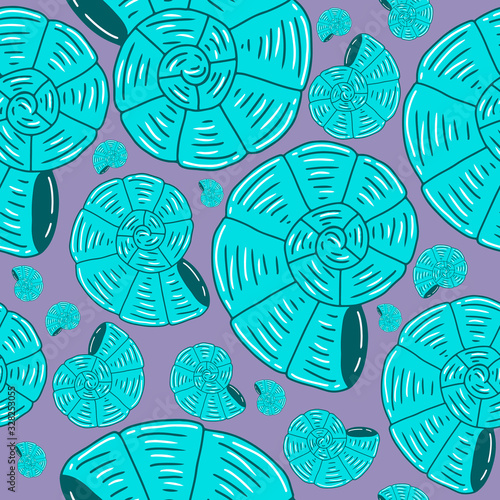Blue spiral sea shell. Underwater clam. Vector seamless pattern. Design for postcard, banner, card. Cartoon style.