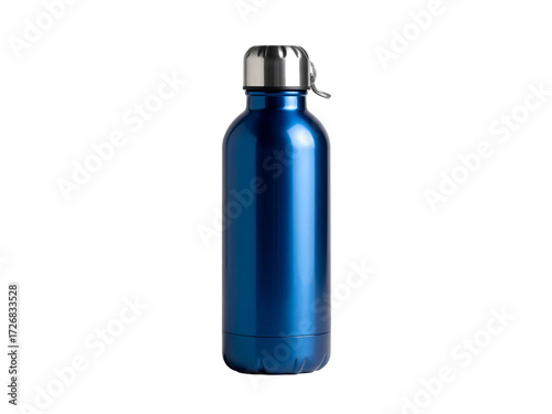 Blue stainless steel water bottle isolated against white background, featuring a modern design and reusable eco-friendly material for hydration on the go.