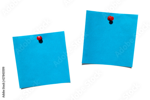 blue stickers fixed on the button. Note paper with space for text on an isolated white background