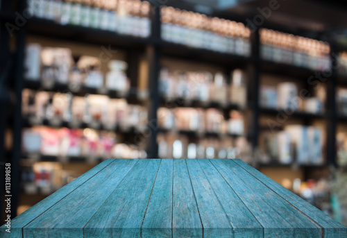 Blue tabletop wooden with blurred cafe background