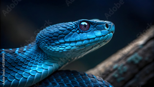Blue Viper Snake Head Close-up with Red Eyes - Reptile Wildlife Detail on Dark Background