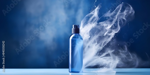 Blue water splash effect on spray glass bottle for minimalist cosmetic design. Concept Water Splash Effect, Spray Glass Bottle, Blue Aesthetic, Minimalist Design, Cosmetic Product