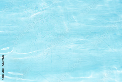 Blue water with ripples on the surface. Defocus blurred transparent blue colored clear calm water surface texture with splashes and bubbles. Water waves with shining pattern texture background.