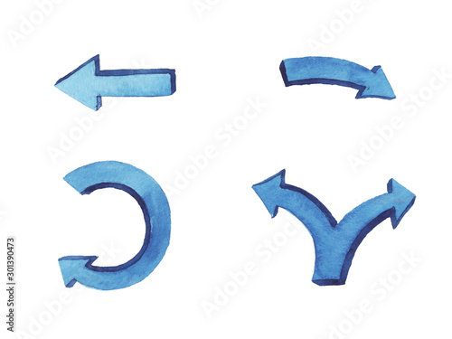 Blue watercolor hand painted brush stroke arrows collection isolated on white background