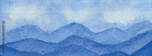 Blue Watercolor Mountain Landscape Art. Abstract watercolor artwork depicting serene blue mountain layers with a soft, cloudy sky, creating a tranquil and artistic design