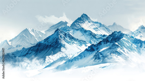 Blue watercolor painting of snow capped mountain range.