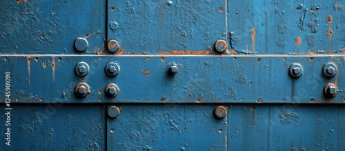 Blue weathered metal sheet texture with bolts and rust, suitable for industrial, construction, or abstract backgrounds and designs.