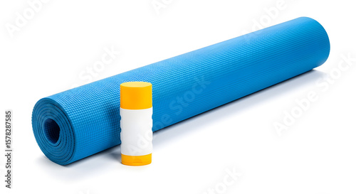 Blue yoga mat rolled up with a white and yellow water bottle on a white background.