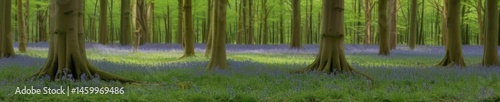 Bluebell emerging from forest floor, beech trees overhead, blossom, green, forest