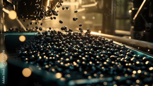Blueberries being processed in a modern facility with machinery and soft lighting effects