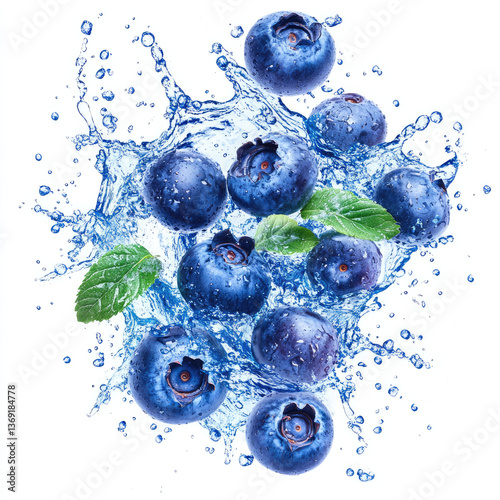 Blueberries splashing with water and mint leaves
