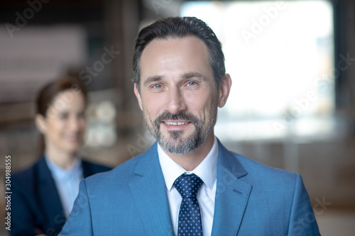 Blue-eyed mature businessman smiling while feeling happy after meeting