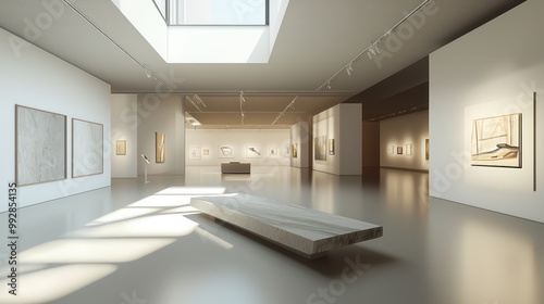 Blueprint of a contemporary art gallery, with a focus on dynamic, adaptable exhibition spaces and natural lighting designs