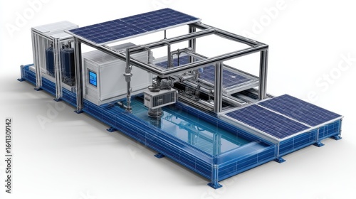 Blueprint-style 3D of a solar-powered autonomous water filtration system with semi-transparent panels, filtration tanks, AI cleaning, and real-time water quality analysis, on white.