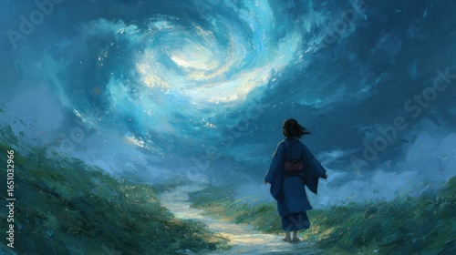 Blue-robed figure stands on a path towards a swirling vortex of light in the sky
