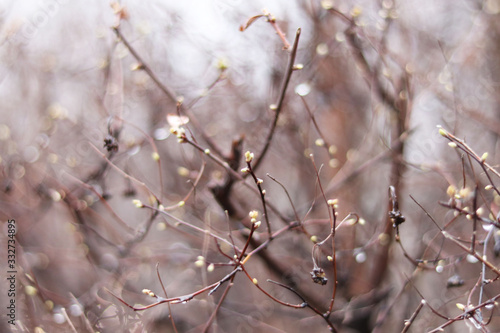 Blurred tree branches in spring, background copy space