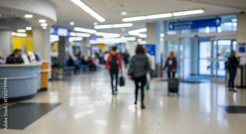 Blurred Abstract Airport Interior with Passengers and Modern Architecture