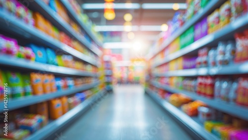 Blurred aisle and shelves in supermarket with bokeh lighting