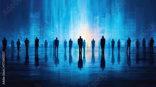 Blurred audience attending professional business conference concept. Silhouetted figures standing in a futuristic blue environment.