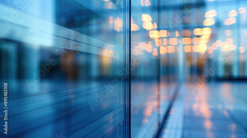 Blurred backdrop of a modern business office with reflective glass surfaces, perfect for sleek design projects