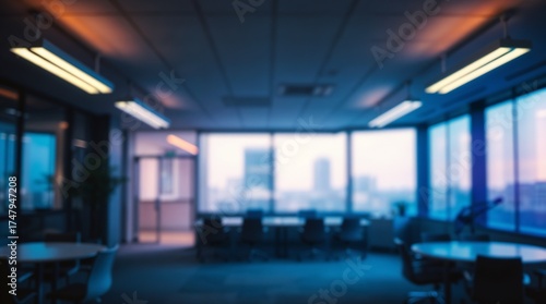 blurred background of a modern office interior with panoramic windows and beautiful lighting, Blurred office meeting room