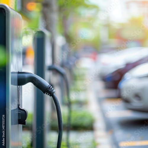 Blurred background of a parking lot with electric vehicle charging stations, supporting sustainable transportation with copy space.