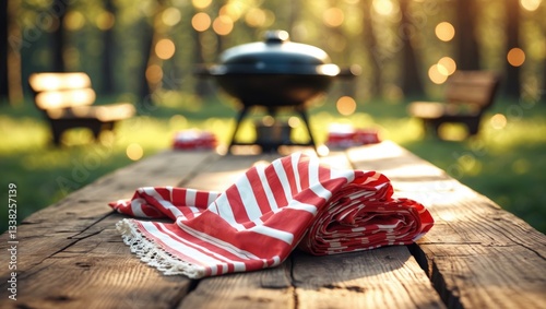 Blurred background of a sunny day in a forest featuring a large wooden table, a black grill, and a striped table napkin.