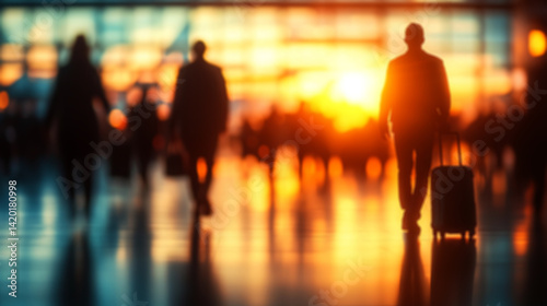 Blurred background of an airport crowded with business people walking and waiting for their flights