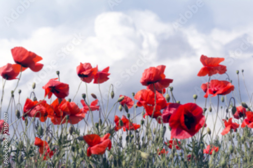Blurred background of flowers Red poppies blossomagainst cloudy sky. soft light. Natural drugs. Soft focus blur