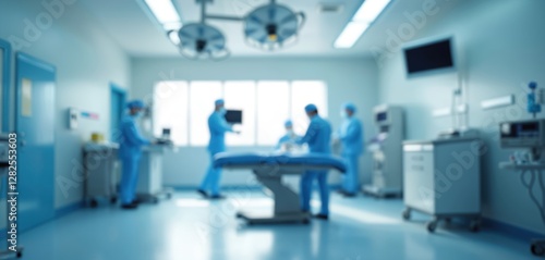 Blurred background of modern operating room with surgeons in blue suits. Scene captures sense of technology, cleanliness, sterility. Health professionals team working in hospital. Suitable for