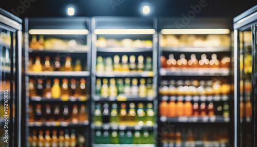 Blurred background of supermarket fridge with bottles of beverages on shelves. Glass showcase.