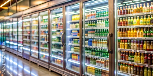 Blurred background of supermarket fridge with bottles of beverages on shelves Glass showcase, drink, supermarket, drink
