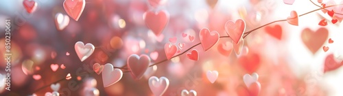Blurred background with flying airy pink and white hearts, love, christmas, party, valentines day