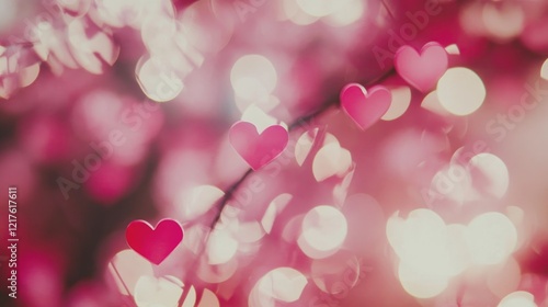 Blurred background with pink and red heart shapes bokeh lights on a soft pink backdrop with Copy Space for text placement