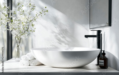 Blurred bathroom interior with an empty white tabletop for product display montage, bathroom counter mockup.