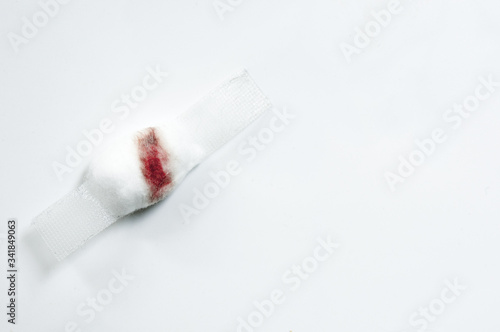 Blurred blood on cotton wool and white plaster on white background. Blood Donation on white background. Morphology vaccines concept.