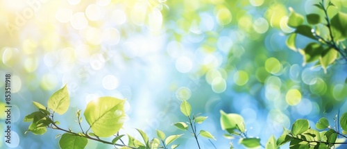 Blurred bokeh background of fresh green spring, summer foliage of tree leaves with blue sky and sun flare