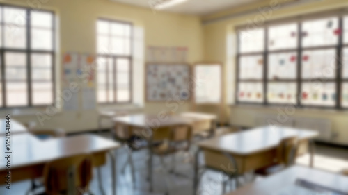 Blurred Bright and Spacious classroom and study room with Wooden Desks and Sunlight Windows