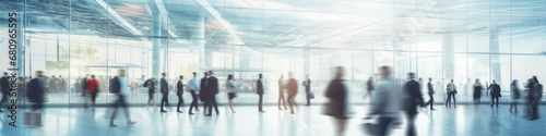 Blurred business people in windows interior. Strolling at an expo conference hall, demonstrating motion speed blur,