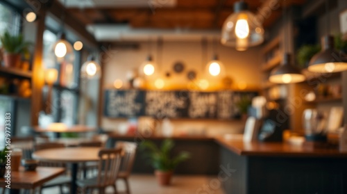 Blurred cafe view shows tables, lights, and counters creating warm ambience. The blurred cafe design conveys a sense of cozy anticipation before entering.