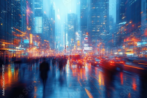 blurred cityscape of bustling business district with streams of light from moving vehicles cool blue tones and motion blur convey urban energy and corporate dynamism