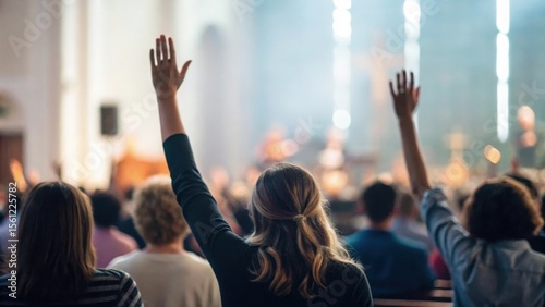 Blurred congregation raising hands in worship during Christian church service