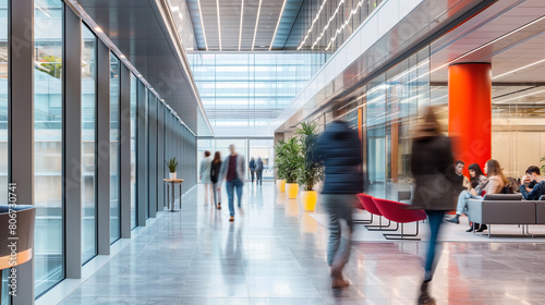 Blurred figures traverse the modern office space with purposeful strides, their movements reflecting the dynamic nature of the bright business workplace.
