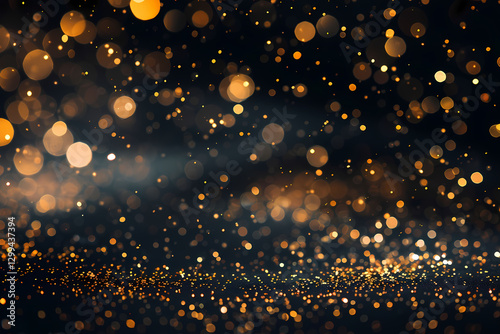 Blurred golden bokeh on black background. Festive black background with golden glitter and bokeh