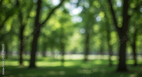 Blurred green trees and grass create a peaceful scene, evoking tranquility