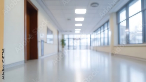 Blurred hospital corridor with clean, modern design and soft lighting, creating a calm and professional healthcare environment, emphasizing clinical and sterile ambiance.