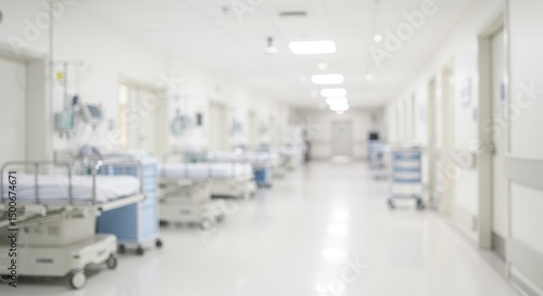 Blurred Hospital Corridor With Empty Beds and Bright White Lights Photo