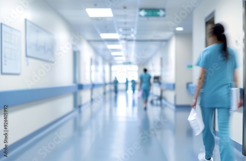 Blurred Hospital Corridor with People in Light Blue and White Tones