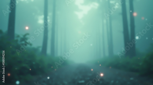 Blurred image of a fabulous natural landscape with a forest and a road, dark green tones, luminous particles, matte and grainy