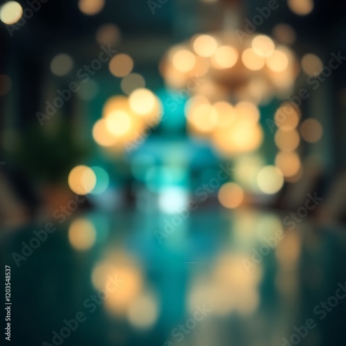 Blurred image of a luxurious indoor fountain with bokeh lights.